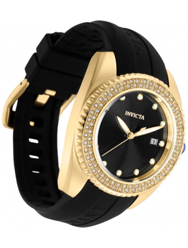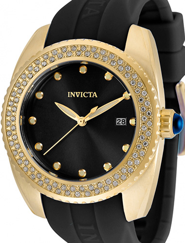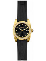 Este impressionante relógio Invicta Angel apresenta um movimento Quartz, tudo em uma caixa de ouro maciço. Seu mostrador de metal preto é envolto por um Cristal Mineral altamente protetor. Este relógio é finalizado por uma forte pulseira de silicone preta e oferece 100 m de resistência à água.